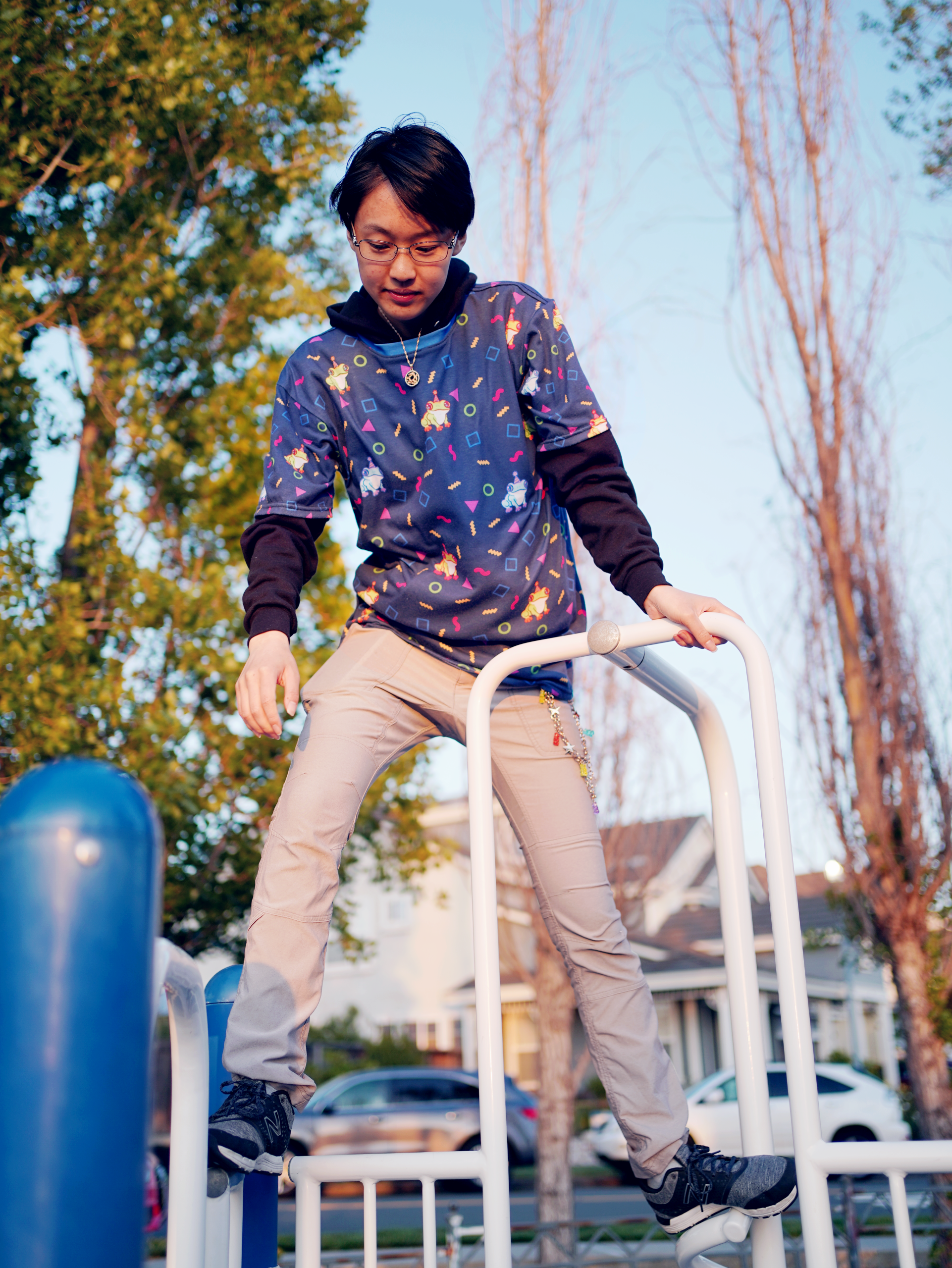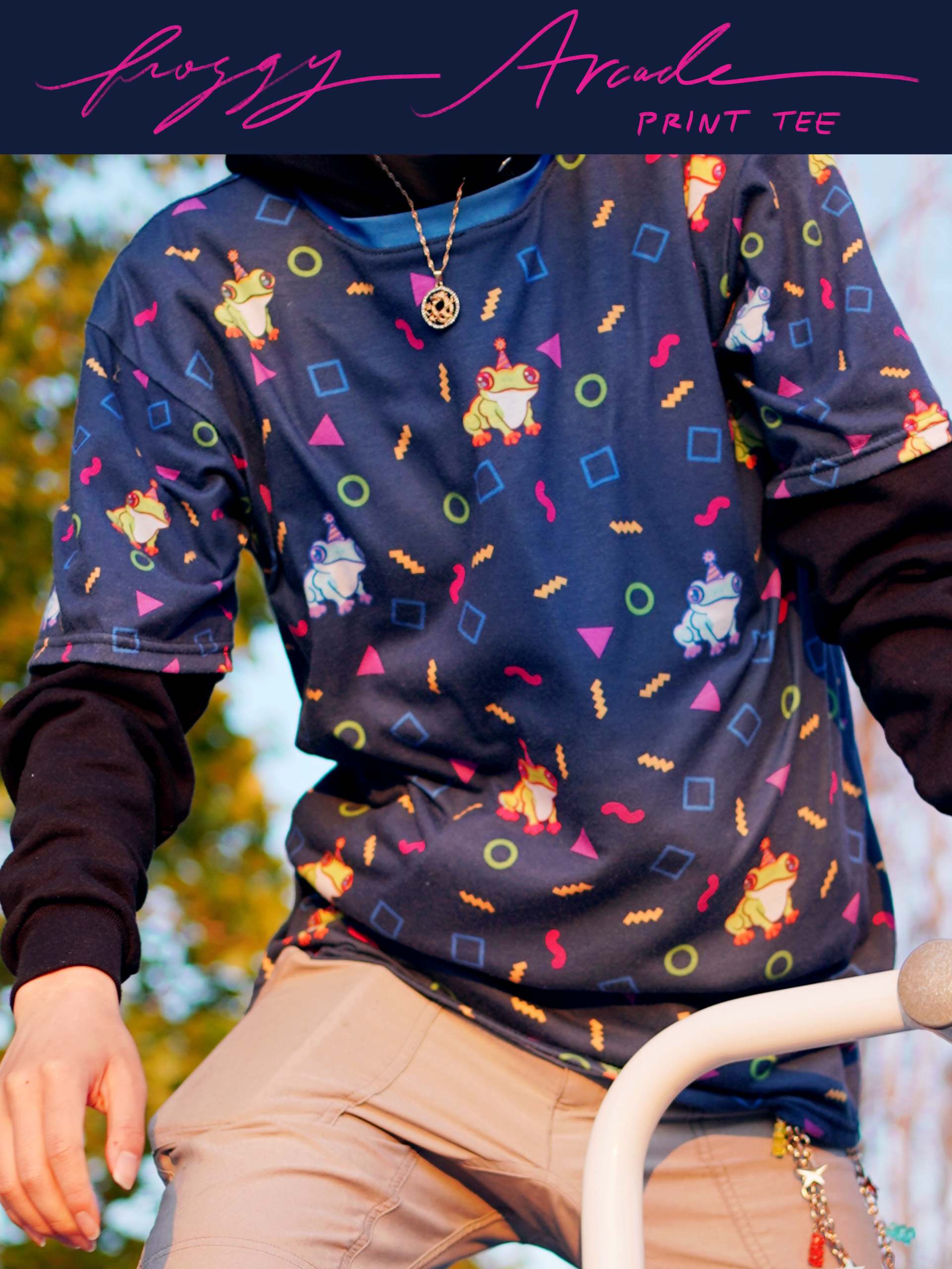 Ever wanted to wear the funky patterns from arcade carpets with all their neon squigglies and shapes? And with FROGS? This t-shirt comes with a colorful print and is made of soft, lightweight, stretchy polyester. A stylish look for a party, tea party, casual or business casual. Also looks good tucked or under an open front hoodie or jacket.